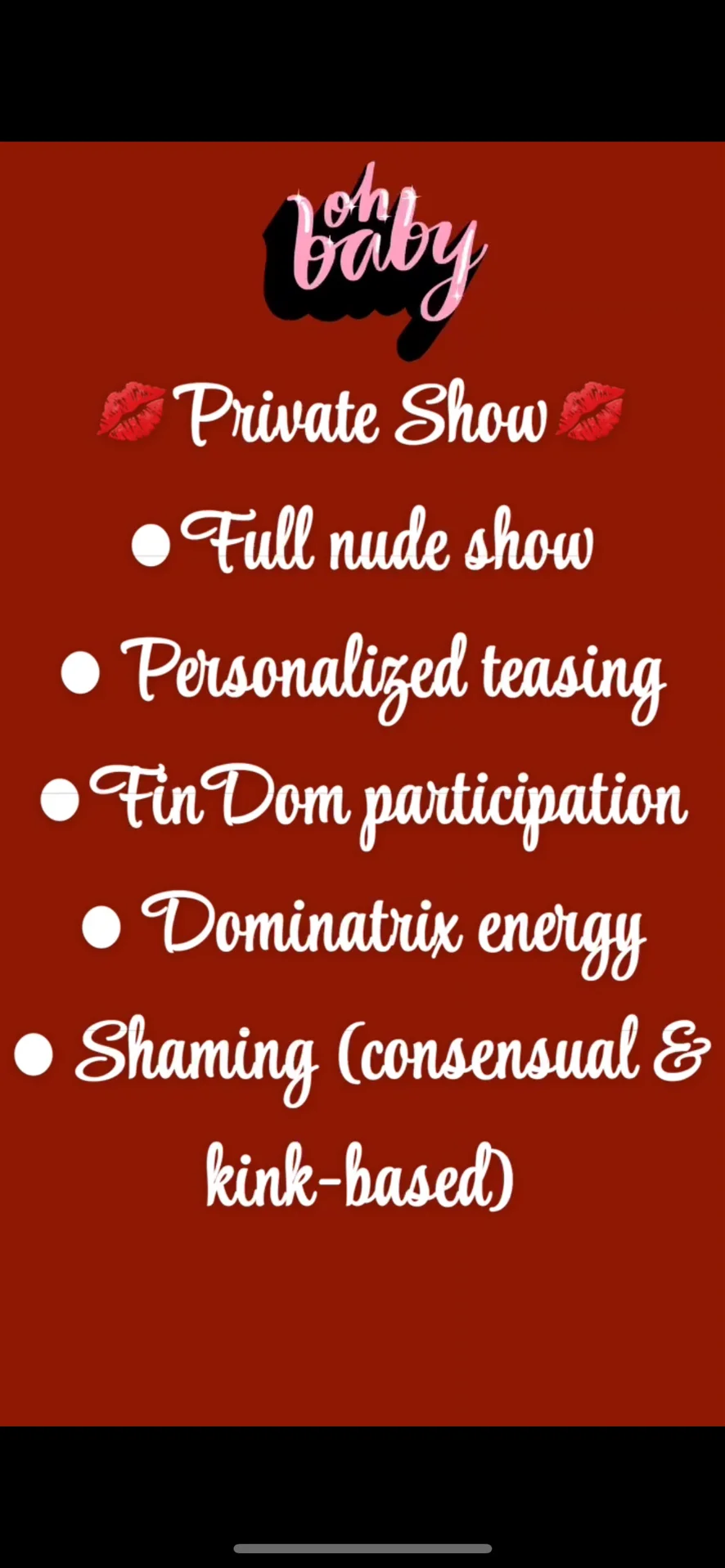 Avsugning, Dildo eller Vibrator, Blottning, Onani, Orgasm, Sexleksaker, Topless, Analleksaker, Kukbetyg, Cosplay, Deepthroat, Snuskprat, Oljeshow, Dusch, Rökning, Striptease, Bröstknull, Twerk, Matlagning, Dubbel penetration, Fingrar, Fot Fetisch, Fotjobb, Gagging, Smiskning